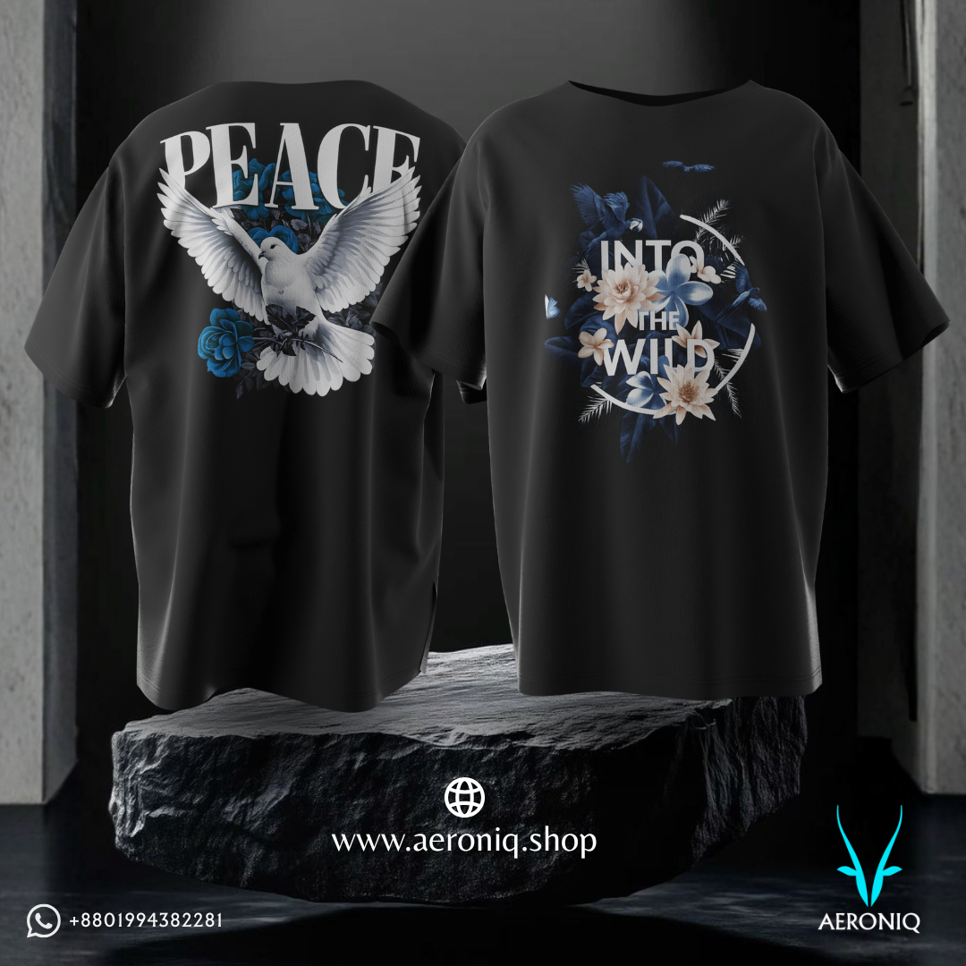 This black T-shirt has a calm and powerful design. The back shows a white dove with blue flowers and the word “PEACE.” The front has a beautiful blue floral design with the words “INTO THE WILD.” It gives a peaceful and nature-inspired look.